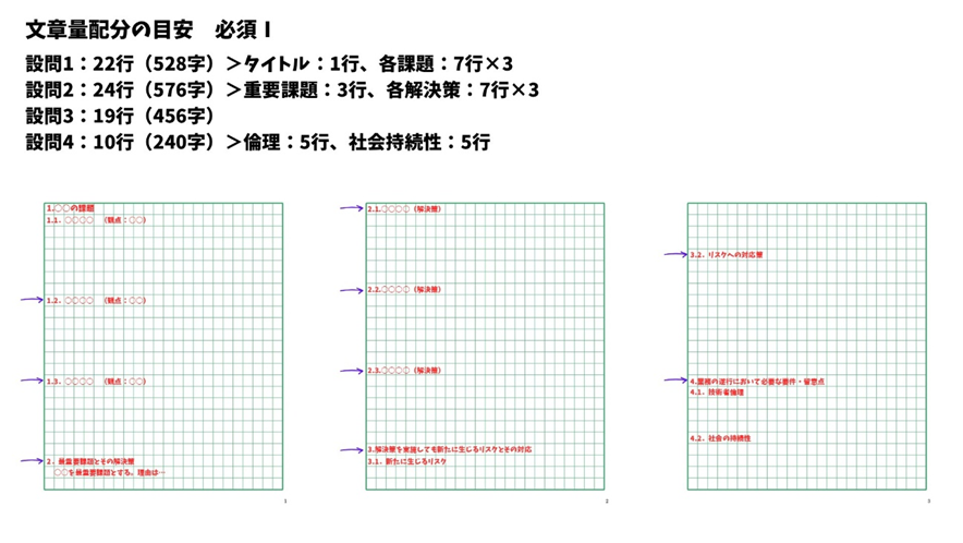 下記のように見出し部分を先に解答用紙の端にメモし、「穴埋め問題」の感覚で論文を作っていくよにすると論文作成のハードルがさがるのでお勧めです。