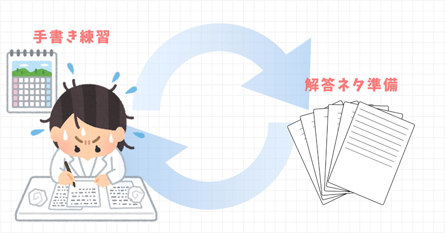 ちなみに、現在は全体スケジュールのこのあたりまで進んでいます。ここからは「解答ネタの充実」「全文作成」「手書き練習」を繰り返すトレーニングになります。