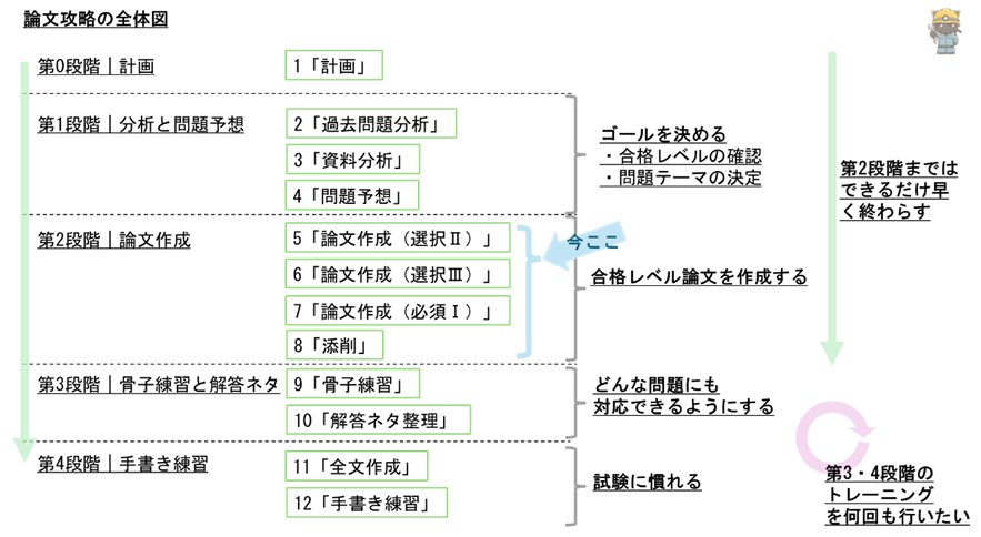本日は、第7ステップ「論文作成(必須Ⅰ)」について解説いたします。第4ステップで決めた予想問題の一つを例にして論文を作成します。目標は合格レベルの論文を1つ完成させることです。
