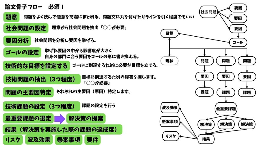 実際に論文に書くのは「技術課題の設定」以降ですが、どのような検討に基づいて課題が設定されたのかを明確にしておくべきです。問題によっては「ゴールの設定」や「技術的な目標設定」あたりまでは問題文中で語られていたります。フローを参考に骨子を作っていけるようにしましょう。