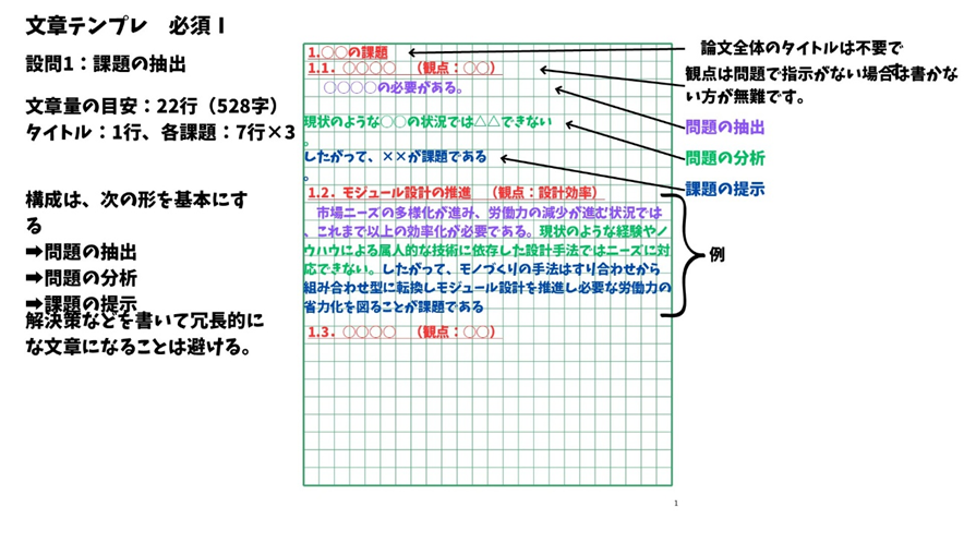 大切なのは内容です。体裁はテンプレート(パターン化)を利用して効率よく論文を書けるようにしましょう。また、全体の分量のバランスも気を付けたいですね。(筆者は、下記のタイトル部分を先に解答用紙に書いてしまってできるだけ「穴埋め問題」の感覚で論文を作っていくようにしています。このやり方の方がなんとなくですが論文作成のハードルがさがるのでお勧めです。)