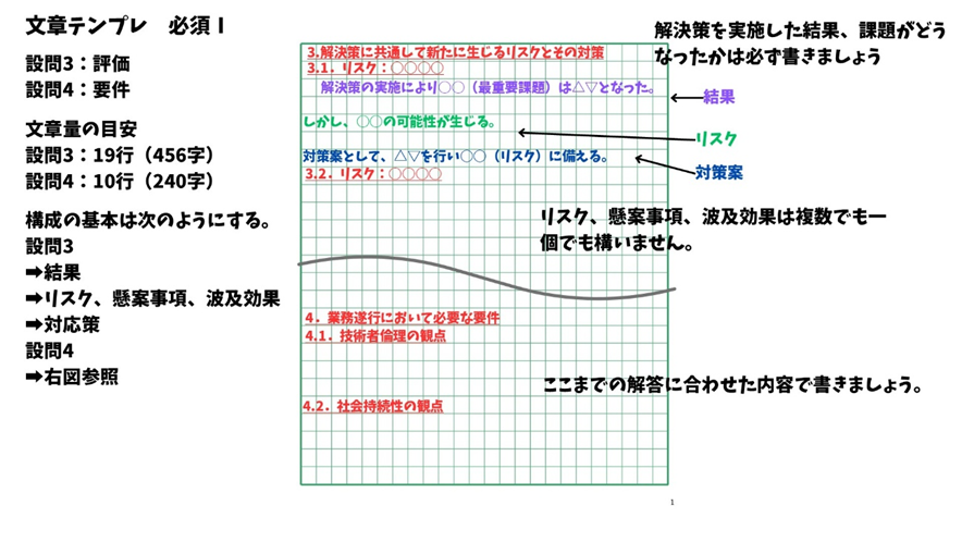 技術者倫理は、必須Ⅰでのみ評価される項目です。よく決まりきった文言をコピペしている人がいますが、論文の内容や問題のテーマにあっていないとダメです。