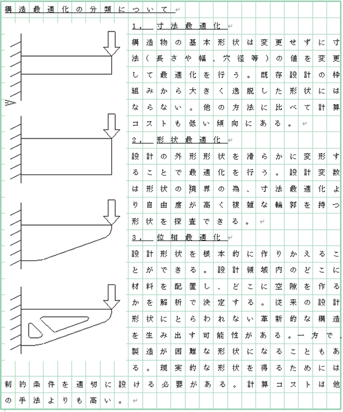 構造最適化は大きく,寸法最適化,形状最適化,トポロジー最適化に分類される。先端に集中荷重が作用する片持ちはりを例にとり,それぞれの構造最適化について24字×8行の範囲に図を描き、相違点を明らかにして説明せよ。