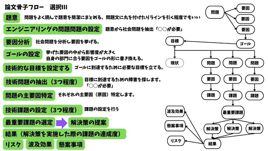 実際に論文に書くのは「技術課題の設定」以降ですが、どのような検討に基づいて課題が設定されたのかを明確にしておくべきです。問題によっては「ゴールの設定」や「技術的な目標設定」あたりまでは問題文中で語られていたりします。フローを参考に骨子を作っていけるようにしましょう。